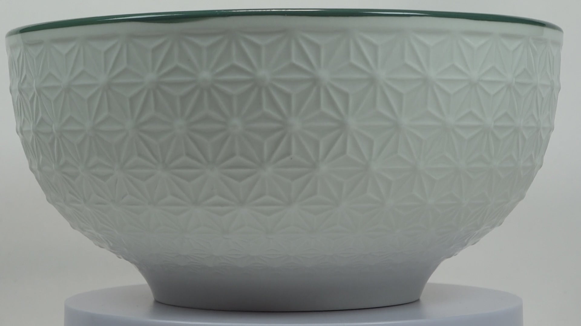 Die angebotene Schüssel mit einem Durchmesser von 16 cm und einem Inhalt von ca. 750 ml hat außen ein blütenförmiges Relief und innen ein grünes Linienmuster.