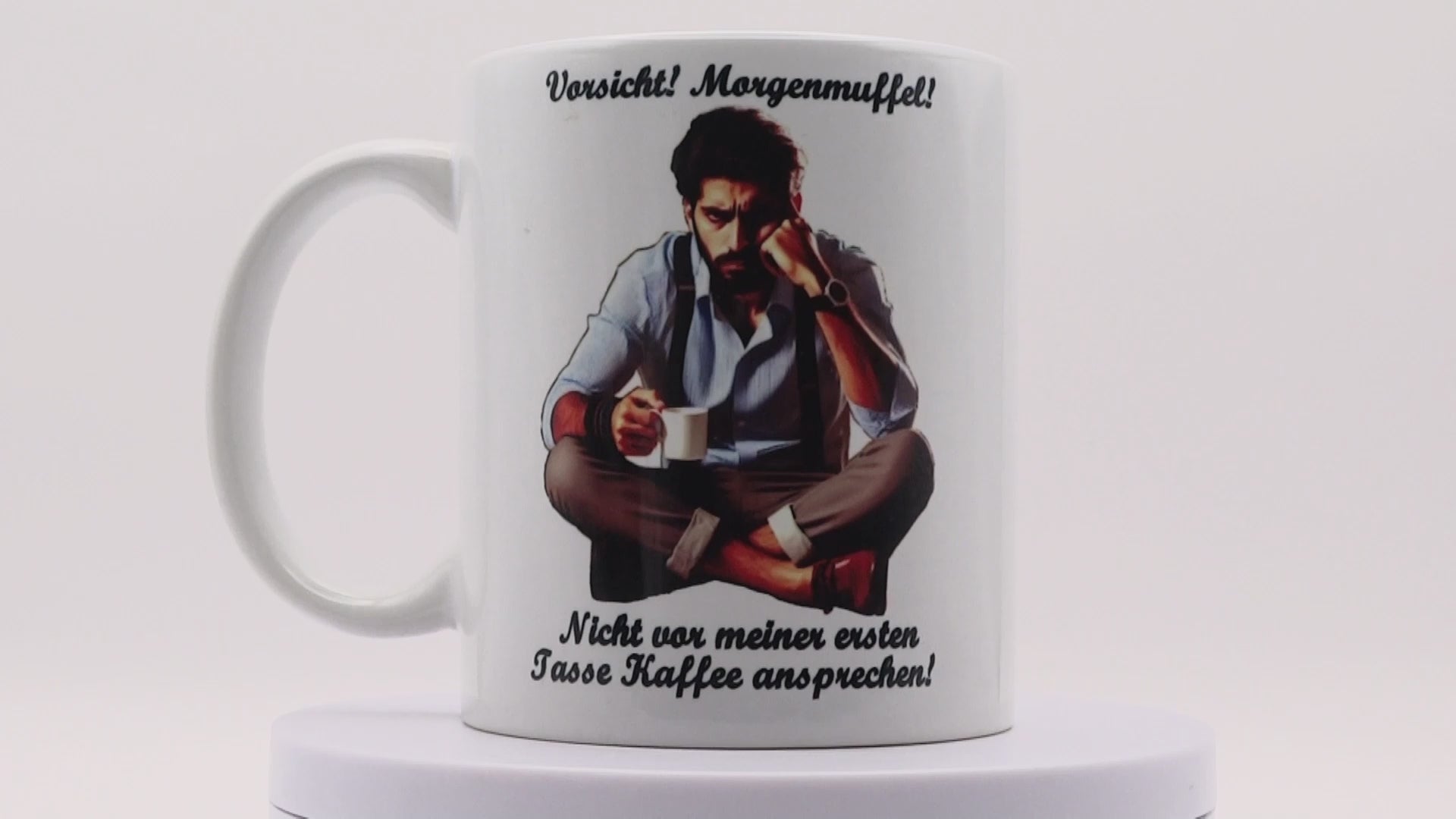 Diese angebotene, elegante Jumbo Tasse aus Keramik zeigt auf 2 Seiten einen mürrischen Mann im Schneidersitz mit einer Tasse in der Hand dem Text in schwarzer Schrift "Vorsicht! Morgenmuffel! Nicht vor meiner ersten Tasse Kaffee ansprechen".